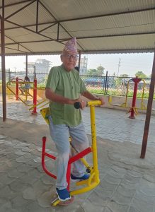 झुम्का बजारमै रहेको घरबाट व्यायामशाला करिव ७०० मीटरमा छ । त्यहाँसम्म रेवती आफैं जान्छन्, लौरो टेक्दै । प्रेसर र सुगरको औषधि सेवन गरिरहेका नेपाल शनि मन्दिर परिशरमा रहेको व्यायामशालाका सबैजस्तो उपकरण एकछिन एकछिन चलाउँछन् । सबै उपकरण चलाएपछि मन्दिर नजिकै बुढापाका बस्ने स्थान छ, उनीहरु आफैले तयार गरेको— केही क्ुर्सि राखिएका छन् ।एक डेढ घण्टा त्यहाँ बिताएपछि घर फर्किन्छन् । रेवती भन्छन् ‘शरिर तन्दुरुुस्त राख्न व्यायाम गरेको ।’