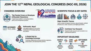 नेपाल भौगर्भिक सभाज –Nepal Geological society -NGS ले सन् २०२६ को नोभेम्बर १९—२१ (२०८३ मंसिर ३—५) मा NGS-12 औं कंग्रेस आयोजना गर्ने निधो गरेको छ ।एनजिएसले बिहिबार १२ औं कंग्रेसको कार्यक्रम तालिका सार्वजनिक गरेको छ । ‘हिमालयको भूगर्भ तथा पहाडी भूविज्ञान मुल शीर्षकमा हुने अन्तराष्ट्रिय सम्मेलनमा, हिमालयन टेक्टोनिक, प्राकृतिक प्रकोप, पूर्वाधार विकास, जलश्रोत तथा डिजिटल जियोसाइन्ससँग सम्बन्धित कार्यपत्रहरु माथि छलफल हुने कार्यक्रम छ ।