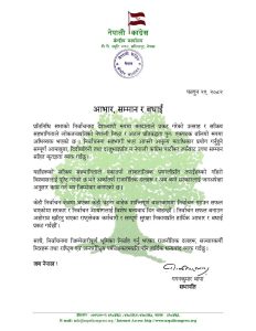 साथै, निर्वाचनमा जिम्मेवारीपूर्ण भूमिका निर्वाह गर्नु भएका राजनीतिक दलहरू, सञ्चारकर्मी मित्रहरू तथा राष्ट्रिय एवं अन्तर्राष्ट्रिय पर्यवेक्षकहरूप्रति पनि हार्दिक धन्यवाद व्यक्त गर्दछु ।