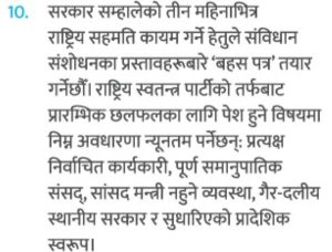 सबै भन्दा पहिला रास्वपाले के भनेको छ ? त्यसको विवेचना गरौं । रास्वपाको १०० बुँदे वाचा पत्रको १० औं नम्बरमा भनिएको छ ‘सरकार बनेको तीन महिनाभित्र राष्ट्रिय सहमति कायम गर्ने हेतुले संविधान संशोधनका प्रस्तावहरुबारे ‘बहस पत्र’ तयार गर्ने छौं । राष्ट्रिय स्वतन्त्र पार्टीको तर्फबाट छलफलका लागि पेश हुने विषयमा निम्न अवधारणा न्यूनतम् पर्नेछन् : प्रत्यक्ष निर्वाचित कार्यकारी, पूर्ण समानुपातिक संसद, सांसद मन्त्री हुन नहुने व्यवस्था, गैर दलिय स्थानीयतह सरकार, सुधारिएको प्रादेशिक स्वरुप ।’