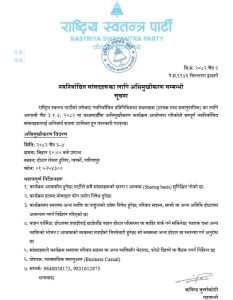 चैत ३,४ गते ललितपुरको ग्वार्को स्थित होटल टुलिपमा हुने कार्यक्रमलाई पार्टीले अभिमुखीकरण कार्यक्रम भनेको छ । रास्वपाका प्रत्यक्ष १ सय २५ र समानुपातिक ५७ गरी १ सय ८२ सांसद छन् ।