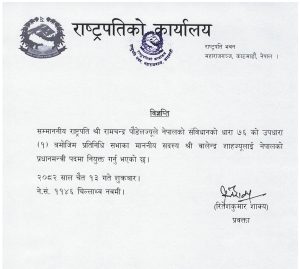 काठमाडौँ, चैत १३ गते । राष्ट्रपति रामचन्द्र पौडेलले राष्ट्रिय स्वतन्त्र पार्टी (रास्वपा)का वरिष्ठ नेता तथा प्रतिनिधि सभाका सदस्य बालेन्द्र शाहलाई प्रधानमन्त्री पदमा नियुक्त गरेका छन् ।